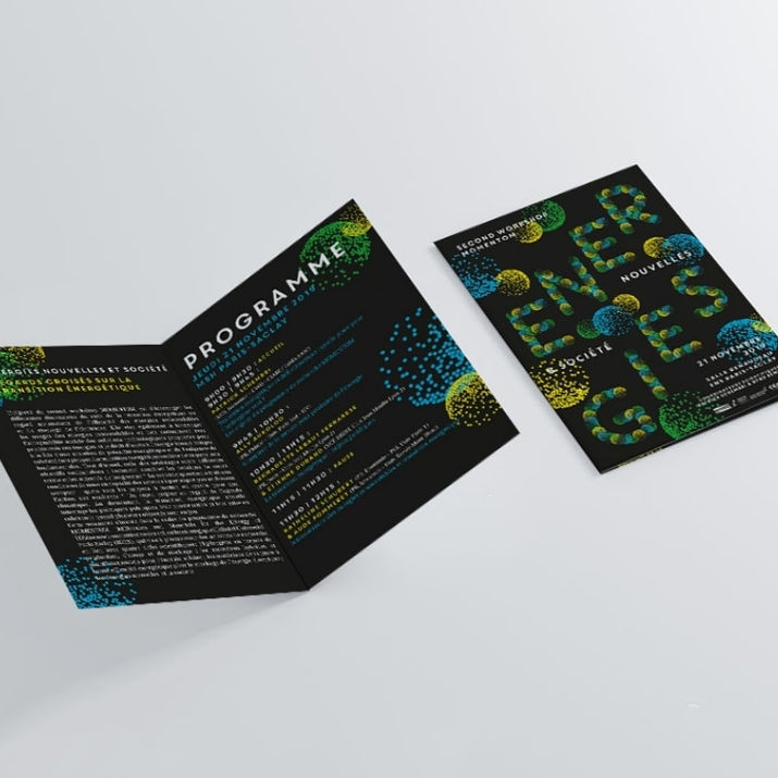 La direction artistique de l'affiche pour le séminaire "Énergies nouvelles et société" allie modernité et symbolisme. Sur fond noir, des bulles colorées flottent, évoquant les lumières urbaines qui illuminent les rues la nuit. Ces sphères lumineuses représentent à la fois l'énergie, les idées novatrices et les échanges qui surgiront lors de cet événement scientifique. Chaque bulle incarne une facette des sciences humaines et sociales, réfléchissant la diversité des enjeux sociétaux liés aux énergies renouvelables et leur impact sur nos vies. La palette de couleurs vives, contrastant avec l’obscurité du fond, capte l’attention et incarne l’espoir et la transformation. Ce visuel dynamique et réfléchi invite à la réflexion tout en évoquant la vitalité et l’importance du dialogue autour des énergies nouvelles dans notre société contemporaine.